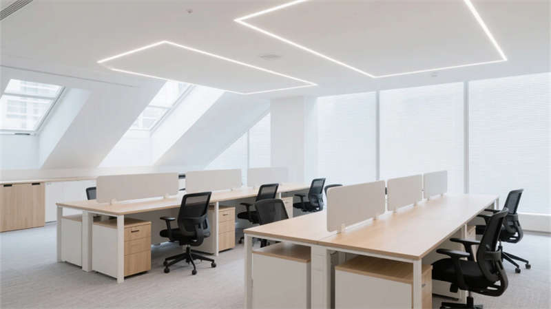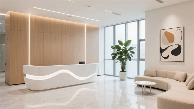 本設(shè)計(jì)以現(xiàn)代簡約為核心理念,通過光與自然的交融重塑辦公體驗(yàn)??臻g以純凈的白色與溫潤木色為主調(diào),輔以低飽和度灰綠點(diǎn)綴,營造通透靜謐的氛圍。落地窗最大化引入自然光線,與線性燈帶共同勾勒出流暢的視覺韻律;綠植貫穿每個(gè)角落,從大堂的琴葉榕到辦公區(qū)的垂直花園,賦予空間呼吸感。