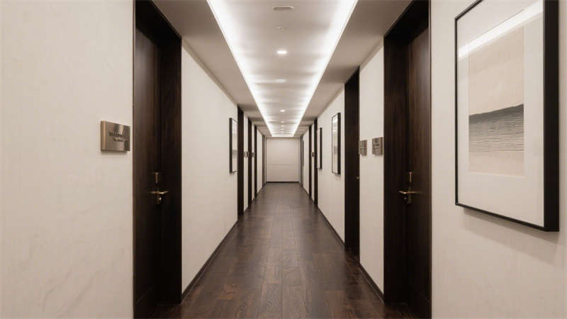 在公共區(qū)域,大堂以開闊通透的布局呈現,大面積的落地玻璃引入充足自然光線,讓空間更顯明亮通透。接待區(qū)選用柔軟的布藝沙發(fā)與金屬質感的裝飾擺件相搭配,既傳遞出溫馨的氛圍,又不失精致格調。走廊設計則注重引導性,墻面采用肌理感材質,搭配嵌入式燈光,營造出靜謐而優(yōu)雅的行走體驗。