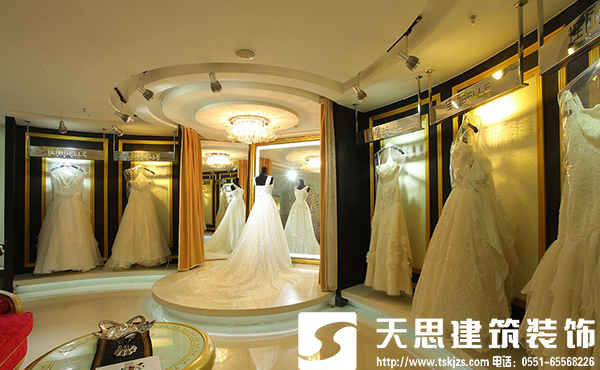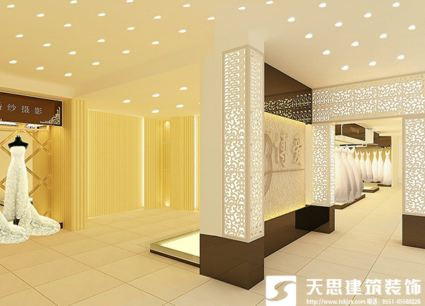 燈光要和色彩的完美的配合,要烘托出一種溫馨浪漫的氛圍。在裝修中大廳燈光的運用首先考慮色溫,一般在2700K的色溫為宜。但局部需要突出產(chǎn)品的還需要用冷光源,例如直射婚紗的光源要用冷光,這樣能感受到婚紗的清潔、明亮、白、艷。